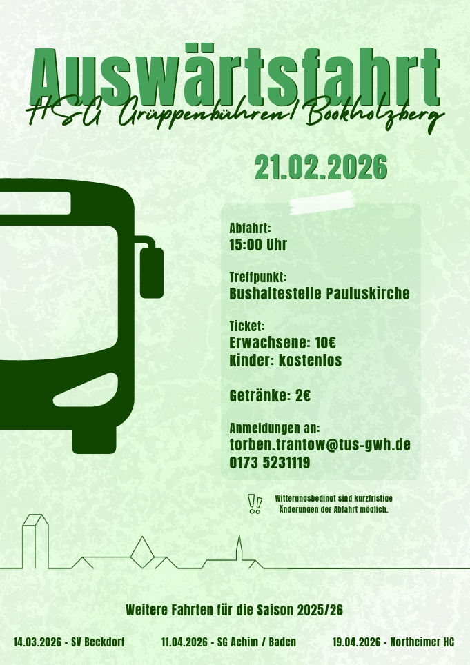 Zum Auswärtsspiel unserer 1. Herren gegen Grüppenbühren/ Bookholzberg am 21.02.26 steht ein Reisebus bereit – seid dabei und unterstützt unser Team lautstark! Abfahrt ist um 15 Uhr an der Haltestelle Pauluskirche. Witterungsbedingt sind kurzfristige ...Unser neuer Sponsorenbetreuer